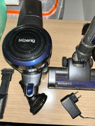 Aspirador sin cable de la marca HKoenig. Incluye varios accesorios para una limpieza completa. - Aspirador de mano. - Cepillo motorizado. - Cargador. H.Koenig Aspirador de varilla y de mano sin cable UP700 PowerClean+ 2 velocidades - Potente - Compacto - Ligero - Autónomo - Silencioso - 120W - Multifunción