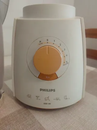 Batidora de vaso Philips con una potencia de 600W. Funciona perfectamente, el vaso cayó y rompió una esquina, pero funciona bien. - Selector de velocidad con 5 niveles. - Función Ice para triturar hielo. - Función Smoothie para batidos. - Función Pulse para un control extra. - Indicadores de funciones con iconos.