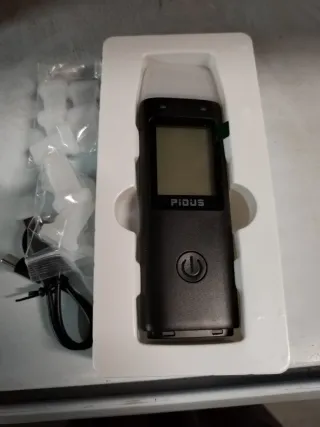 Alcómetro digital de la marca PIDUS, ideal para pruebas de alcoholemia. Incluye accesorios. - Pantalla digital. - Botón de encendido/apagado. - Diseño compacto y portátil. - Incluye cable de carga USB. - Varios boquillas de repuesto.