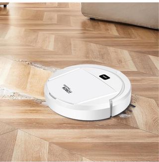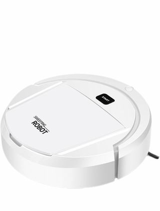 Robot aspirador de limpieza en color blanco. - Diseño redondo y compacto. - Botón de inicio visible en la parte superior.