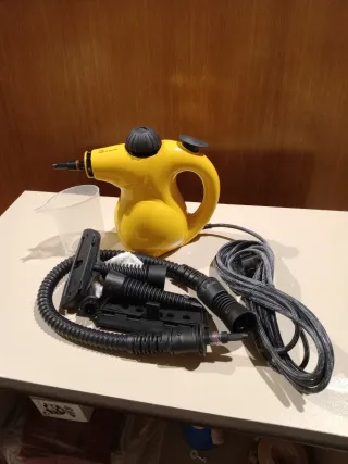 Limpiadora a vapor de color amarillo brillante, ideal para diversas tareas de limpieza. - Incluye accesorios para diferentes usos. - Manguera flexible. - Cable de alimentación.