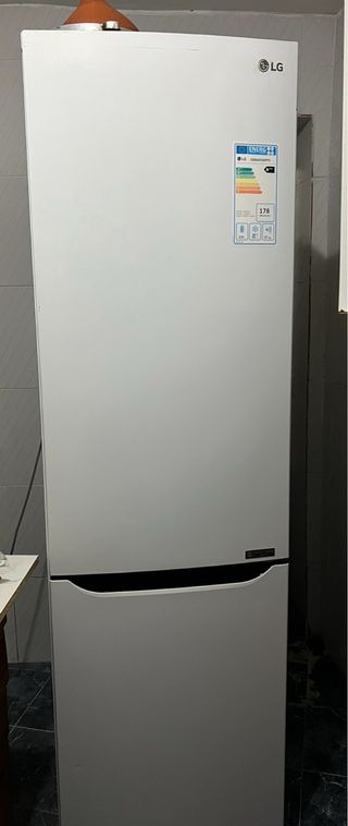 Refrigerador LG de color blanco. - Diseño moderno y elegante. - Etiqueta de eficiencia energética visible.
