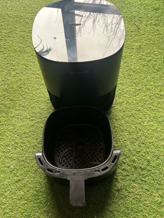 Freidora de aire con un diseño moderno en color negro y detalles dorados. Ultilizado pocas vezes acompaña todo manual de instrucciones incluso una carpeta con receitas. Ni contesto propostas indecentes. - Panel de control digital. - Acabado brillante.