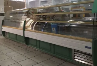 Se venden dos vitrinas, una para pasteles y otra para helados. - Diseño curvo con acabados dorados. - Base con paneles verdes y detalles blancos.