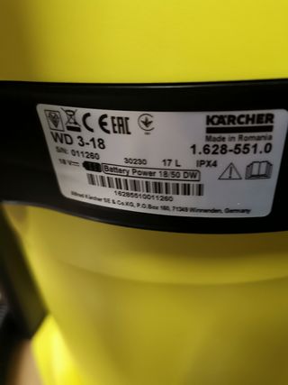 SEMANA BLACK FRIDAY! No negociable! Nuevo, con factura de venta y garantia del fabricante! Aspirador 3 en uno : aspira humedo y seco y tiene funcion soplador. karcher modelo wd 2-18, deposito de 12L. Cuerpo solo, sin baterias ni cargador. Con boquilla fina y cepillo, tubo, ruedas, y bolsa. Completa mente nueva sin uso. Se envia en caja de cartón neutra. Hago envios x la aplicación, x inpost (previo pago x bizum o PayPal) o entego en mano, más cosas en mi perfil.