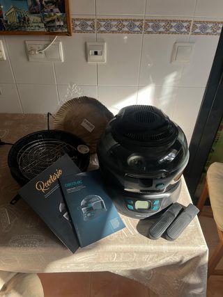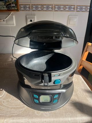 Vendo freidora sin aceite Cecotec TurboCecofry 4D Healthy de segunda mano en bastante buen estado. Incluye pack de bandejas de papel (de regalo), recetario y manual de instrucciones. La vendemos porque casi no la usamos. Características: - Capacidad de 3L (hasta 1,5 kg de comida) - 8 programas preconfigurados (y función yogurt) - Temperatura regulable (100-240 ºC) y temporizador - Cocina a dos niveles y remueve sola - Cubeta antiadherente con revestimiento cerámico Pack de: Cuerpo principal. Cubetas. Mangos desmontables para las cubetas. Parrilla horneado a dos niveles. Pala Mezcladora. Instrucciones y recetario. Salvamanteles.