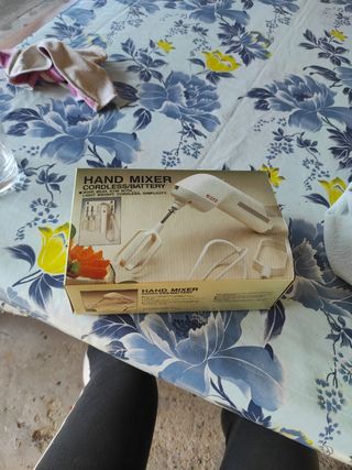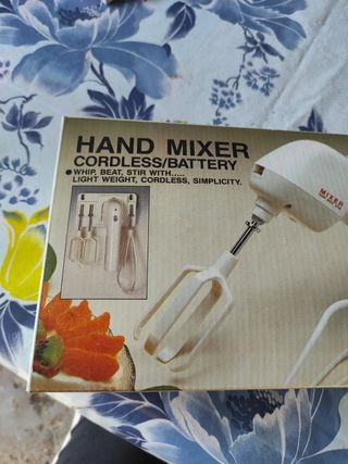 Batidora de mano inalámbrica, sin estrenar, en su caja original. Es ligera y fácil de usar. - Funciona con pilas o con batería. - Incluye batidores y accesorios adicionales. - Diseño sencillo y elegante.