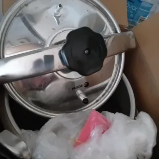 Olla a presión Fagor Chef Extremen de 15 litros. Ideal para uso profesional. - Capacidad: 15L - Material: Aluminio - Apta para cocinas a gas - Presión: 50 kPa La saque y la limpie como ponia en las instruciones.No la he podido utilizar porque no me vale para inducción. SIRVE: Vitroceramica y gas.