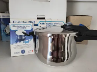 Olla a presión Magefesa Easy Express, en perfecto estado a estrenar. - Capacidad de 6 litros. - Hasta un 70% más rápida. - Cocina sana y equilibrada. - Ideal para 7 comensales. - Incluye libro con 50 recetas.