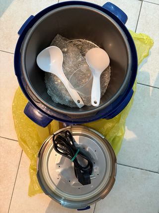 Olla eléctrica programable de la marca COCICHEF. Cuenta con un panel de control digital y múltiples funciones. - Panel de control con pantalla digital. - Funciones preestablecidas para Arroz, Verduras, Legumbres, Pescado, Carnes, Tarta, Asados, Sopa y Recalentar. - Botones de Tiempo, Cocinar y Cancelar. - Diseño moderno en acero inoxidable y detalles en azul. -Incluye libro de recetas. -Incluye accesorios Muy poco uso prácticamente nueva