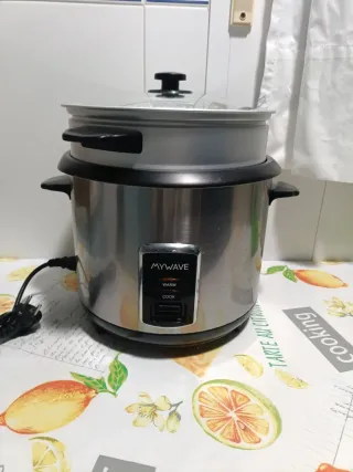 Olla arrocera Mywave de acero inoxidable con vaporera. - Diseño moderno y funcional. - Incluye vaporera. - Panel de control con funciones 'Warm' y 'Cook'.