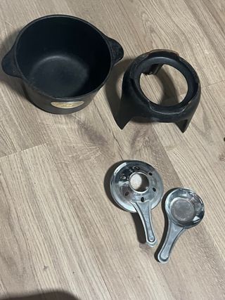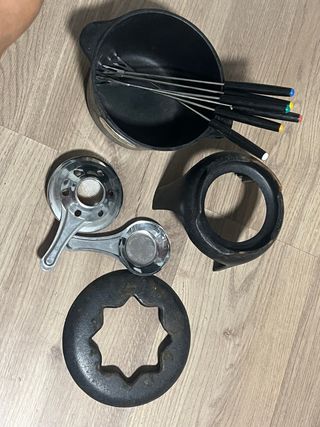Preciosa olla de fondue de metal, ideal para disfrutar de una velada acogedora con amigos o familia. Incluye seis pinchos con mangos de madera. La olla es de color negro y se encuentra en buen estado. - Perfecta para preparar queso, chocolate u otras recetas de fondue. - Seis pinchos para servir incluidos. - Base estable para una cocción segura.