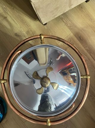 - Estructura metálica negra. - Detalles en cobre. - Tapa de cerámica decorada. Le falta la cazuela barro
