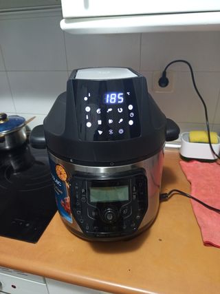 Olla a presión multifuncional Tefal en buen estado. - Permite cocinar una variedad de platos. - Dispone de varias funciones de cocción, incluyendo cocción a presión, cocción lenta y vapor. - Fácil de usar con panel digital intuitivo. - Incluye accesorios.