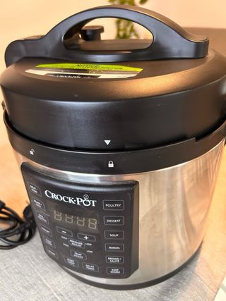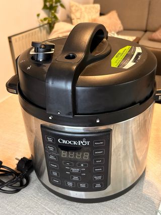 Olla rápida eléctrica CrockPot Express con 12 funciones en 1. - Cocina hasta un 70% más rápido. - 8 programas de cocción one-touch. - Funciones: Cocinar a presión, dorar/saltear, cocer a fuego lento, cocinar al vapor y más. - Pantalla digital. - Acabado en acero inoxidable.