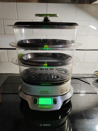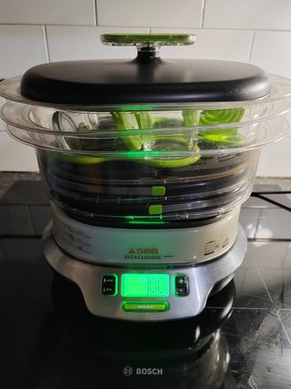 Cocina sana. Cocinar a vapor hasta 3 platos distintos. Se puede usar solo 1 compartimento, o hasta 3. Es de la marca SEB. Accesorios incluidos: 4 vasitos de cristal especiales para el vapor. Cuando está recogido para guardar, mide 32cm de alto.