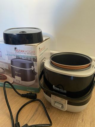 Olla eléctrica Astan Hogar, modelo La Ollita. Muy práctica para cocinar. - Color negro y blanco. - Incluye tapa. - Cable de alimentación. - Paletilla sin usar. Utilizada dos veces en una escapada. El arroz lo hace muy rapido y muy bueno, tambien puedes hacer pequeños guisos. Te salva de un apuro. La vendo porque necesito espacio en casa.