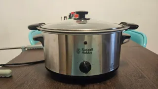 Olla de cocción lenta Russell Hobbs de acero inoxidable con tapa de cristal. - Capacidad ideal para varias raciones. - Selector de temperatura con 3 niveles. - Indicador luminoso de funcionamiento.