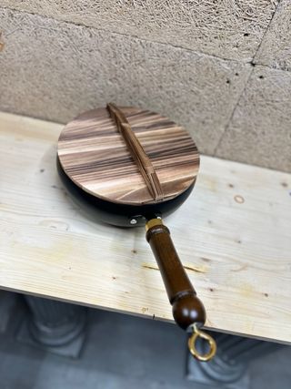 Sartén u olla antiadherente con tapa de madera y mango. - Diámetro de 24cm. - Tapa de madera con diseño a rayas. - Mango de madera con detalle dorado. - Aro para colgar en el extremo del mango.