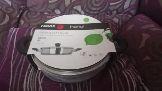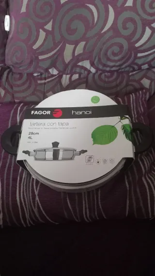 Tartera/ Olla Fagor Hanoi de acero inoxidable con tapa. - Diámetro: 28 cm - Capacidad: 4 L - Material: Acero inoxidable - Apta para todo tipo de cocinas, incluida inducción. Tartera con tapa de marca Fagor. Nueva a estrenar. Toda la información necesaria está en las fotos.
