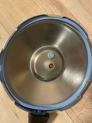 Tapa de repuesto para olla a presión de la marca Kuhn Rikon, usada pero muy cuidada. Las piezas de recambio, mando, disco de información azul, gomas, indicador de presión y válvula nuevos, usados una vez. Diámetro 22cm