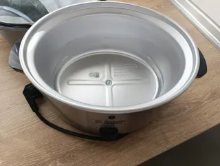 Capacidad: 3,5 litros, adecuada para hasta cuatro raciones. Características: Cuerpo de acero inoxidable, cazuela apta para sellar en fogones, y tapa de cristal para supervisar la cocción. Uso: Ideal para preparar platos caseros con cocción lenta. usado únicamente dos veces en perfecto estado