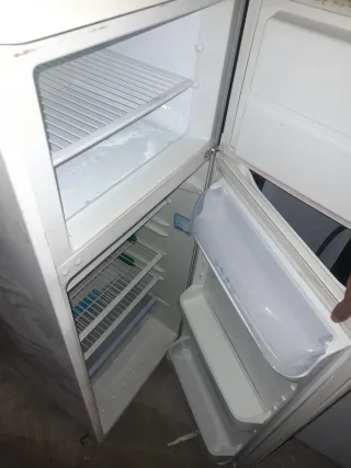 Nevera pequeña en buen estado, ideal para espacios reducidos. - Medidas compactas. - Tres estantes de cristal. - Dos cajones transparentes en la puerta.
