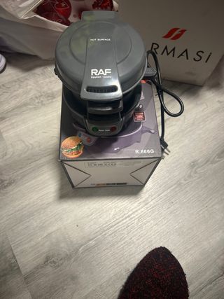 Máquina para hacer hamburguesas de la marca RAF, modelo R.666G. Cuenta con una potencia de 600W. - Potencia: 600W. - Fácil de limpiar. - Recubrimiento antiadherente. - Calentamiento uniforme. - Incluye manual de instrucciones.