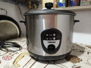 Arrocera de la marca Tristar, ideal para preparar arroz de forma sencilla. Acabado en acero inoxidable. Indicadores luminosos para Cook y Warm. Panel de control frontal. Gran capacidad 1.5l hasta 10 raciones. Fácil de limpiar. Perfecto estado, la vendo por no usar