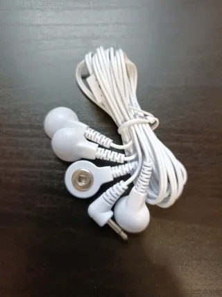 Cable blanco para máquina de masajes. El cable está enrollado y sujeto con una goma. - Conector jack de 2.5mm. - Cuatro electrodos. - Color blanco.