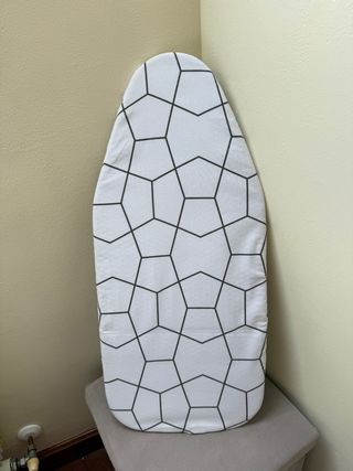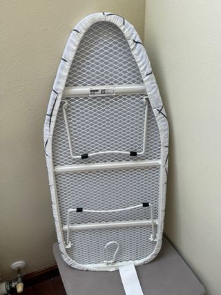 Tabla de planchar compacta con funda. Tamaño ideal para espacios reducidos. Se puede colgar en la puerta o en la pared; incluye un gancho.