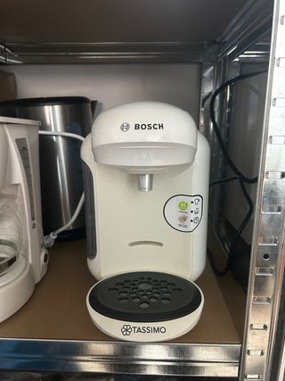 Cafetera Tassimo Bosch XS de color blanco en buen estado. Es compacta y fácil de usar. - Marca: Bosch - Modelo: Tassimo XS - Color: Blanco - Incluye base