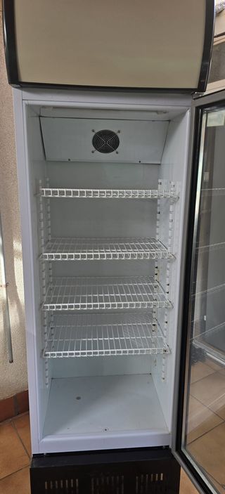 Expositor frigorífico con una puerta de cristal. Elegante diseño e iluminación LED. Rango de temperatura 0 a 10 grados. Refrigeración ventilada. Desescarche y evaporación automática. Termostato digital. Ruedas. - Estantes interiores. - Parte inferior con rejilla.