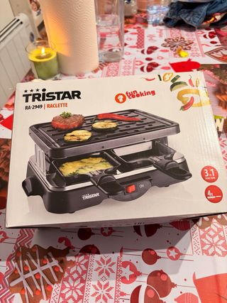 Plancha y raclette Tristar RA-2949. - Plancha grill. - Raclette. - 3 funciones en 1. - Para 4 personas. Se ha abierto pero no se ha utilizado nunca.