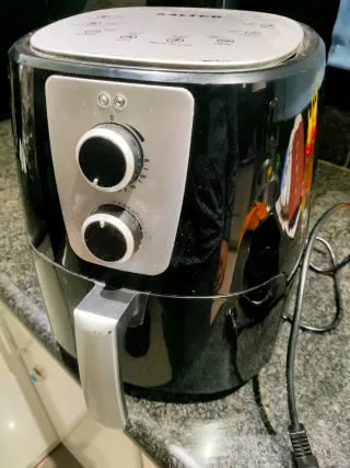 Freidora de aire marca Salter en color negro. Cuenta con dos mandos giratorios para ajustar la temperatura y el tiempo. - Diseño compacto. - Asa frontal para extracción. - Indicadores luminosos. Air frier, aire frier, Air fryer