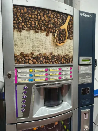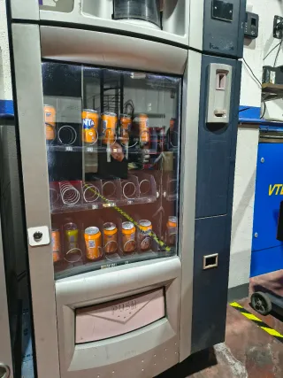 Máquina expendedora de refrescos, ideal para negocios o espacios comunes. - Diseño plateado y negro. - Panel frontal con PUSH para dispensar. - Compartimento para monedas visible.