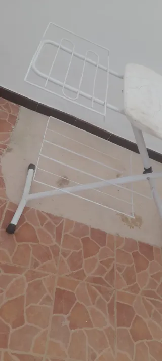 Tabla de planchar semiprofesional con estructura metálica y superficie acolchada. Material muy resistente. Solo necesita funda nueva. En perfecto estado. - Plegable para fácil almacenamiento. - Incluye tendedero lateral. - Bandeja inferior para plancha.
