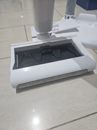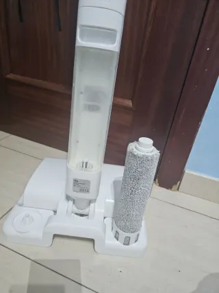 Práctica fregona y aspiradora eléctrica para mantener tu hogar limpio. En perfecto estado, menos de un año en uso. Mando factura de Amazon para la garantía - Diseño moderno en blanco y plateado. - Incluye accesorio de rodillo adicional.