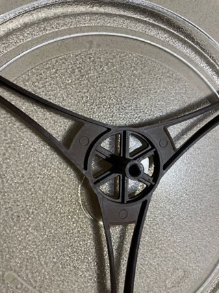 Plato de cristal para microondas, ideal para reemplazar uno roto o dañado. Su diseño transparente se adapta a la mayoría de los hornos. - Material: Cristal templado. - Diámetro aproximado: 24.5 cm. - Conexión central de 3 puntos.