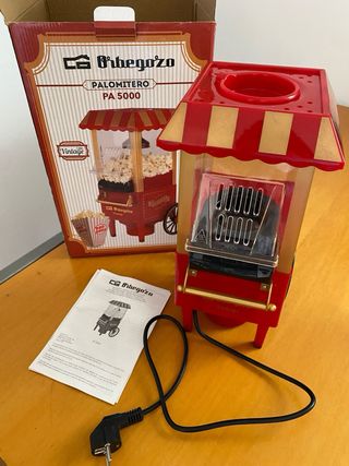 SÓLO acepto envíos que NO sean con Correos, gracias. Palomitero Orbegozo Medidas del palomitero: 23 x 18,5 x 38,5 cm. Peso: 1,25 kg. Potencia: 1200 W. Conexión: 220-240 V ~ 50 Hz. Palomitero portátil. Atractivo diseño vintage. Funcionamiento sencillo y rápido. Cazoleta reforzada para una mayor resistencia. Cacito medidor de maíz incluido. Incluye recetas para palomitas de sabores. Funcionamiento con aire caliente, SIN aceite. Poco uso, como nueva y con caja.