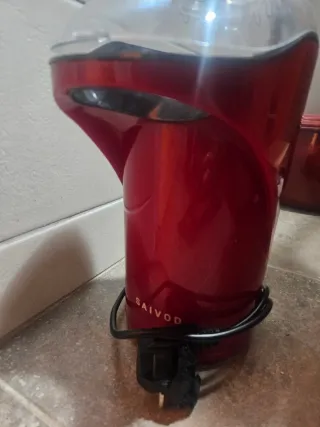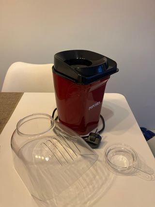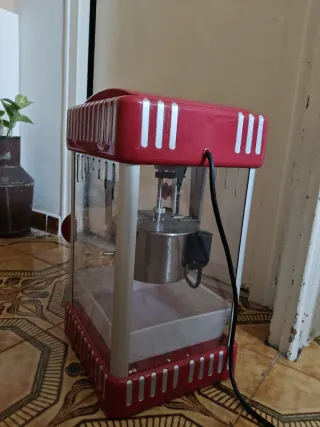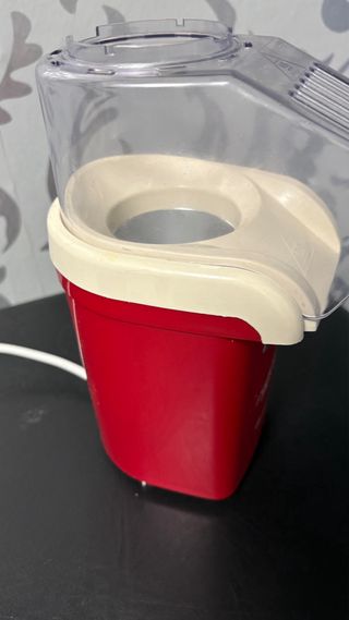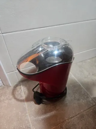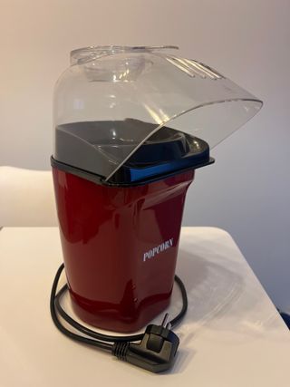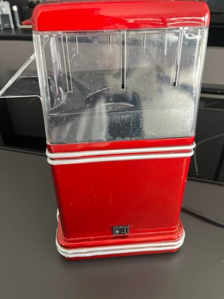 Máquina de palomitas de color rojo con tapa transparente. - Diseño compacto. - Interruptor de encendido/apagado. - Comprada en el Corte Inglés y usada solo una vez.