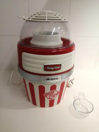 Nos la regalaron y la usamos el primero dia para la navidad, pero no somos muy de palomitas, por eso la vendemos. Literalmente casi sin uso. Tiene todos sus accesorios, manuales y caja, bolsas y protectores. La caja tiene una pequeña rutura de cuando se abrio, pero el resto esta impecable. La verdad que va bien, se debe calentar 2 minutos antes, luego pones el mais y a los pocos minutos ya empieza a hacer las palomitas. Modelo 2957 = Party Time, con un diseño retro en rojo y blanco. - Diseño divertido y compacto. - Tapa transparente para ver la preparación. - Base con rayas rojas.