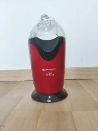 Máquina de palomitas de aire caliente de la marca Orbegozo. El plástico transparente está un poco deformado pero no impide si correcto funcionamiento. - Color rojo y negro. - Diseño compacto y divertido. - Tapa transparente superior.