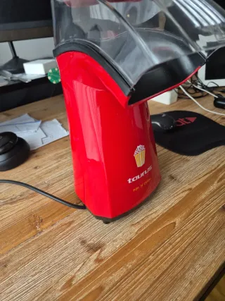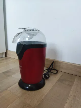 Máquina para hacer palomitas de maíz de color rojo. - Diseño compacto y fácil de usar. - Tapa transparente con salida para las palomitas. Utiliza aire caliente para hacer palomitas de forma saludable, sin necesidad de aceite ni grasas adicionales. El proceso es rápido, normalmente en unos 3 minutos. Suele incluir una tapa medidora para calcular las raciones de maíz. Su diseño es compacto y fácil de limpiar y almacenar. VENTA EN PERSONA