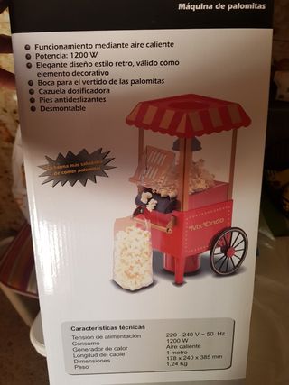 Máquina de palomitas con un diseño retro que evoca las clásicas máquinas de cine. - Estructura roja con detalles dorados. - Ventana transparente para ver las palomitas. - Ruedas decorativas. Si funciona pero se apaga cuando se sobrecalienta asi que sirve más de decora ión que para hacer palomitas Palomitera