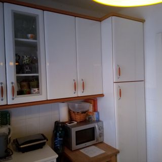 Armario de almacenaje en color blanco, diseñado para colocar encima de una lavadora o secadora. Dimensiones exteriores: 190 x 65 x 32 cm, las demás están en una de las fotos. Se entrega montado en nuestra casa, cabe en el ascensor. Dos puertas superiores, tres baldas ajustables. Acabado liso. Nos mudamos, y en la casa nueva no lo necesitaremos. Se vende sólo el armario, el contenido y la secadora aparecen a modo ilustrativo.