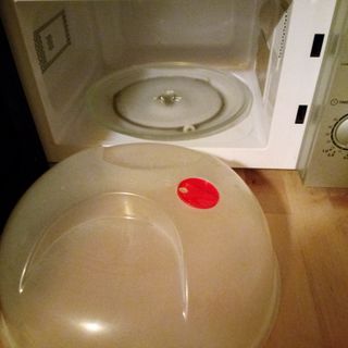 Microondas en color plateado, con puerta frontal y panel de control. - Diseño compacto. - Acabado metálico.