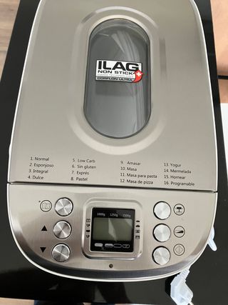 Panificadora de la marca ILAG, ideal para preparar pan casero, masa o yogur. - Panel de control con pantalla digital. - Diseño moderno en color blanco y plateado.