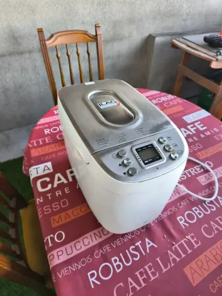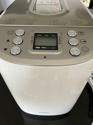 Panificadora completamente automática, 15 programas digitales, programa especial sin gluten, temporizador digital, capacidad de 900 gramos, Blanco. Potencia 600 vatios. Voltaje 230. Interior de acero inoxidable. Carcasa de plástico resistente al calor y protección contra sobrecalentamiento. Base anti-deslizante y tapa con ventana de visualización. Solo se usó una vez, por falta de tiempo para cocinar. Pesa 5,7 kgs. PVP en tienda: 73€