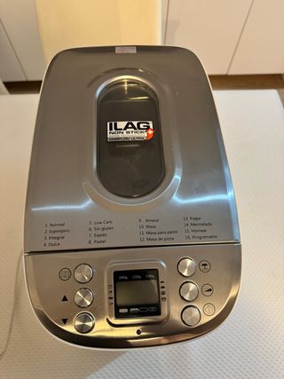 Panificadora ILAG con recubrimiento antiadherente. - 16 programas de cocción. - Capacidad para panes de 1000g, 1250g y 1500g. - Pantalla digital. - Diseño moderno en color blanco y plateado.